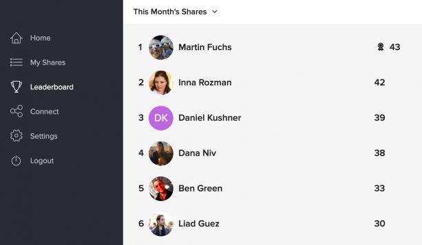 Oktopost’s Board features a public, built-in Leaderboard where employees can view Shares (the number of posts the employee has shared using his or her profiles) and Clicks (the number of clicks on links included in the posts generated by this sharing).