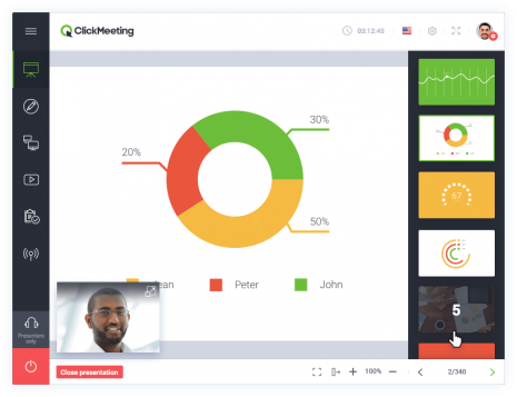 ClickMeeting is well-suited for small to medium-sized businesses. It offers all the standard functionality of a webinar platform with some special features like integrated monetization options, polls and surveys, as well as group and private chats during live events.