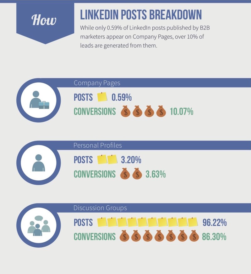 This infographic by business2community will break down LinkedIn into real numbers. As you can see, over 10% of leads are generated from posts on B2B company pages!