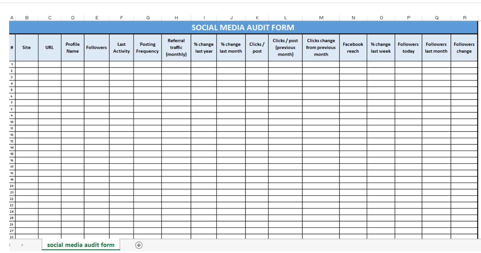 You’ll need a place to organize and tabulate your data, so fire up your favorite spreadsheet program or use one of the many free templates you can find on the web. In this audit sheet, you’ll enter data from all of your social media profiles, including basic information about each account as well as key metrics like follower count, posting frequency, and engagement.