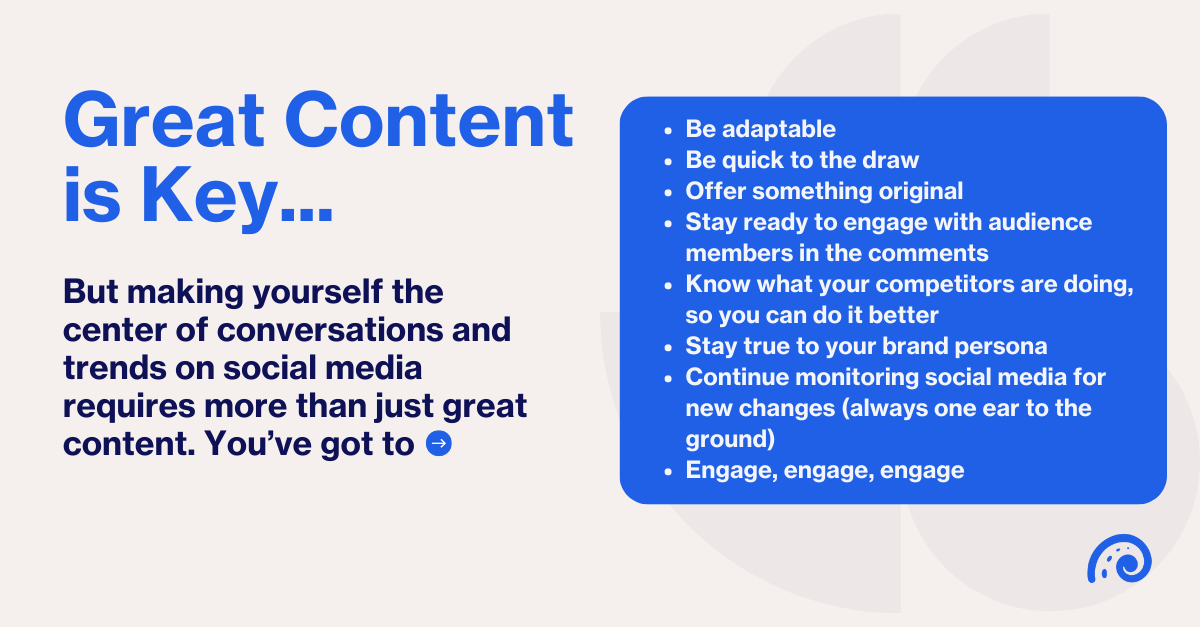 To perform well on social media, you’ve got to be a part of that ever-shifting landscape. Your ability to repurpose quality content with the right social media publishing tools at the drop of a hat will be the ultimate test. Quality content is inherently flexible because it’s quality content. The directive is that flexible content isn’t always quality. Don’t produce content that doesn’t ultimately satisfy your first intention, so you can shoot from the hip later on. However, when the opportunity presents itself – a trending topic, a shift in cultural attention – for you to repurpose that quality content, and if you can get it right, the rewards are plentiful.