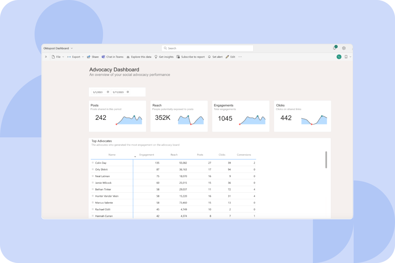 Our integration with Microsoft Power BI enables you to measure and optimize what matters most for B2B. It provides businesses with a comprehensive view of their marketing analytics by seamlessly pulling real-time Oktopost data into Power BI and combining it with other business data.