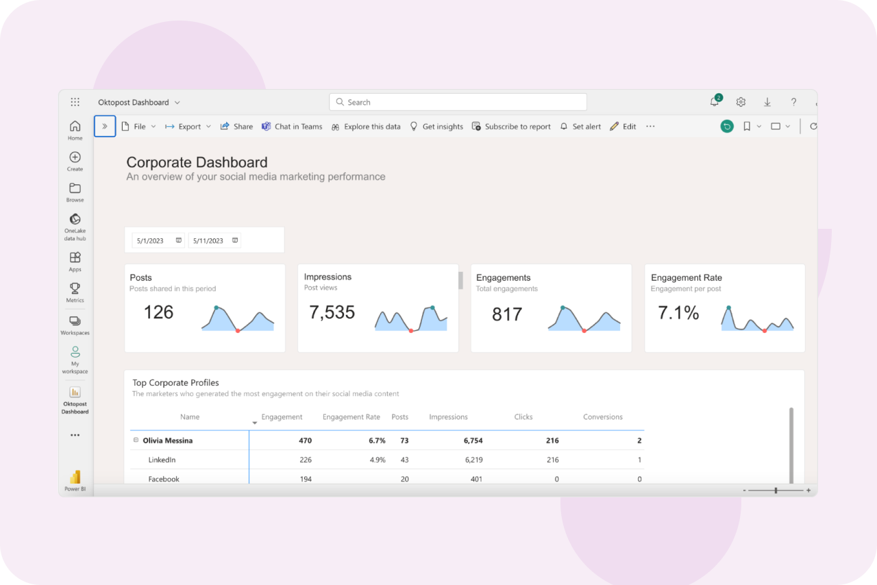 Our integration with Microsoft Power BI enables you to measure and optimize what matters most for B2B. It provides businesses with a comprehensive view of their marketing analytics by seamlessly pulling real-time Oktopost data into Power BI and combining it with other business data.