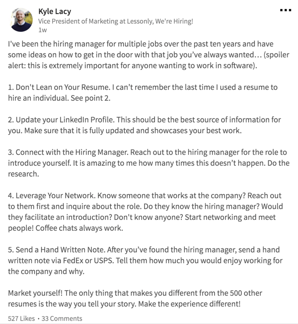 One way is by removing website links altogether and letting the posts speak for themselves. Instead of directing users to your company blog, try summarizing the key points of an article in a LinkedIn status update. Break down paragraph into short sentences or bullet-point form, like this: