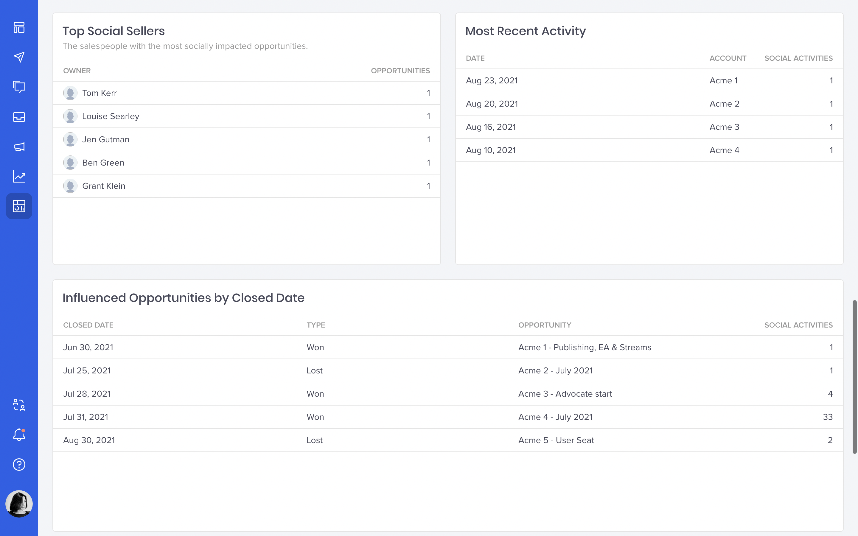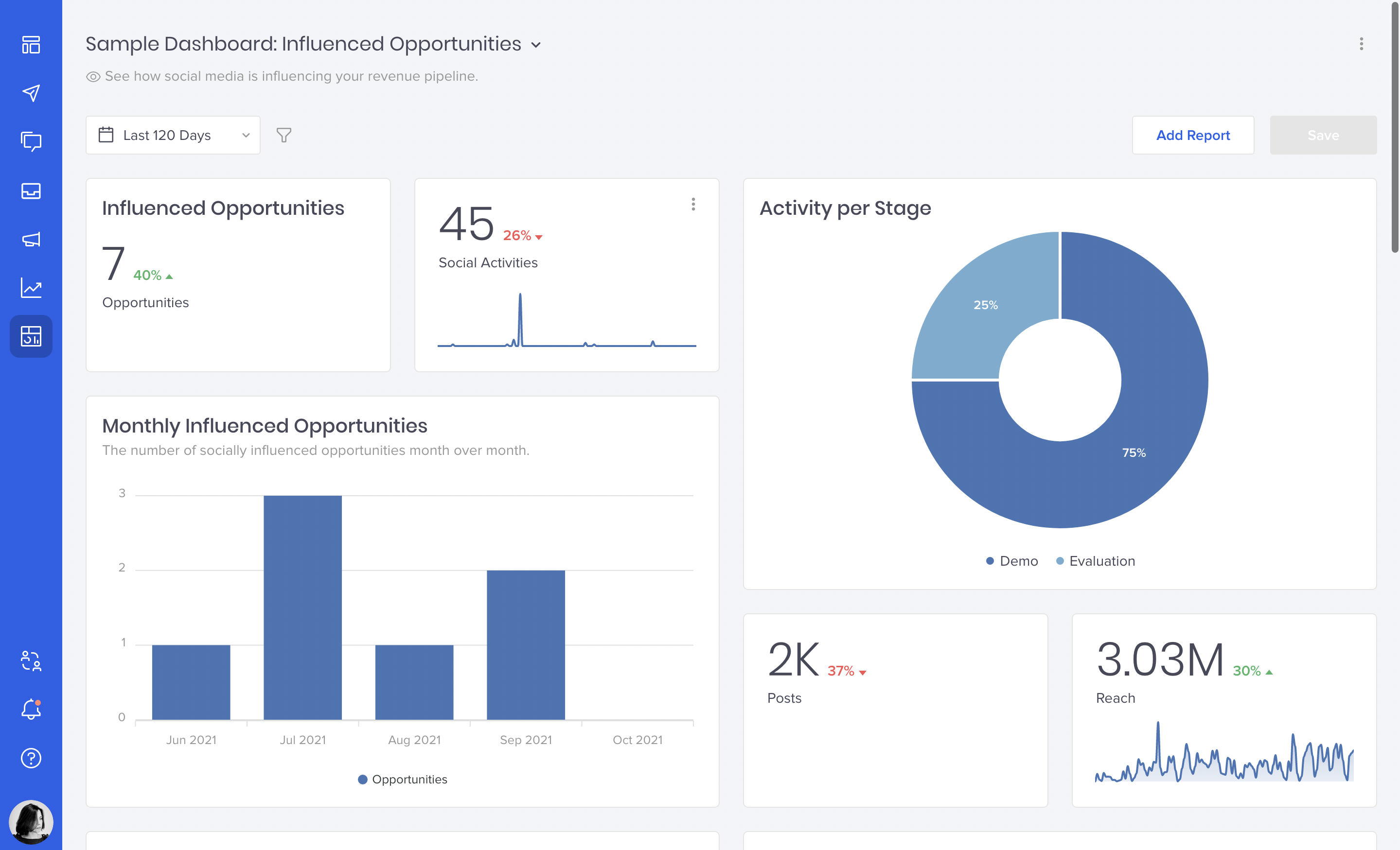 Like any other Social BI dashboard, you’ll be able to set and customize each Influenced Opportunity report with metrics your team should care about and filter out the rest. We encourage every B2B marketer to report on things that matter to their business instead of using another cookie-cutter analytics tool that will fail to deliver real value.