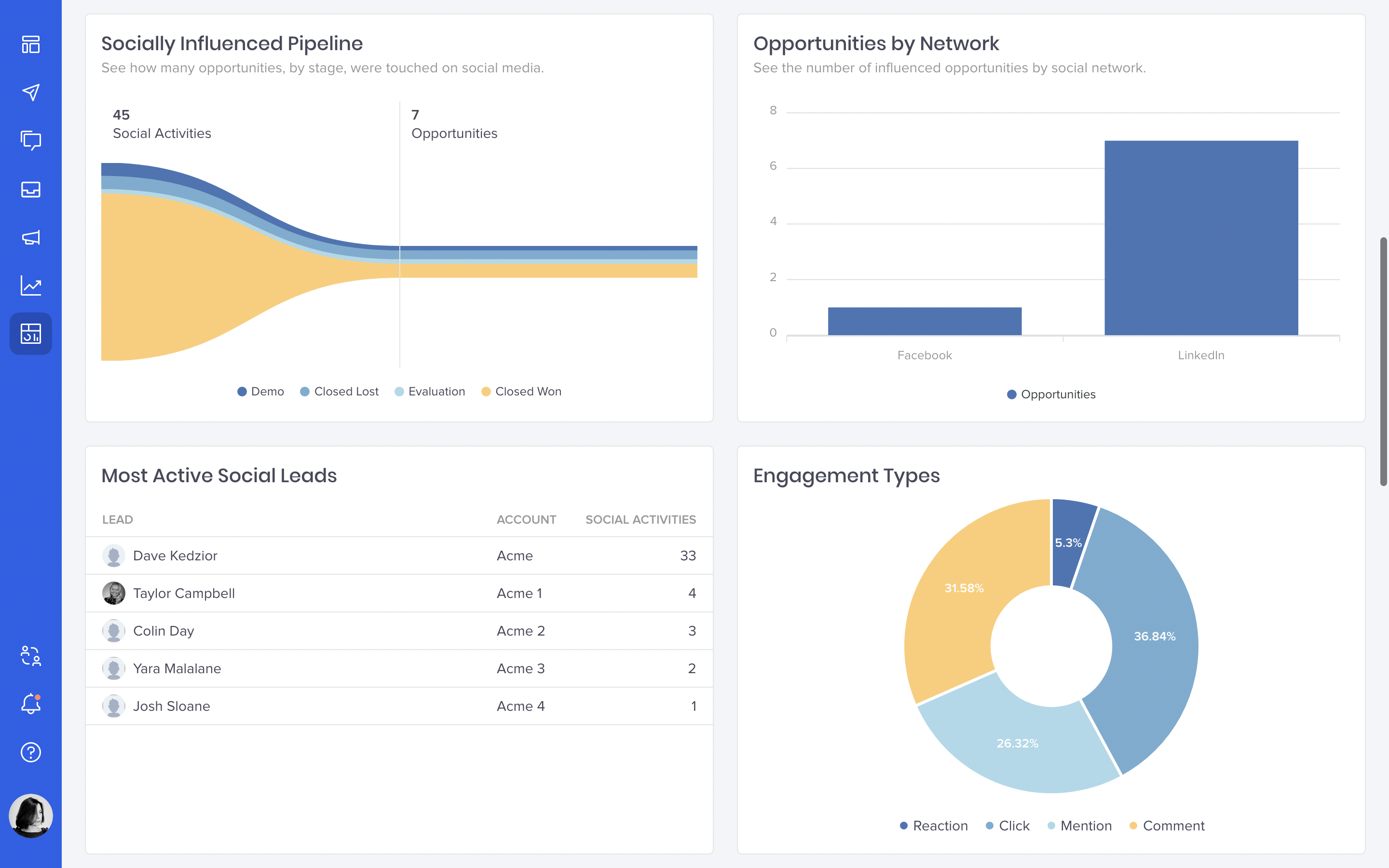 For example, seeing that opportunity contacts most often engage with your social accounts during the demo stage can inform your strategy: share more middle-of-the-funnel content to get the right information in front of your prospects at the right time.