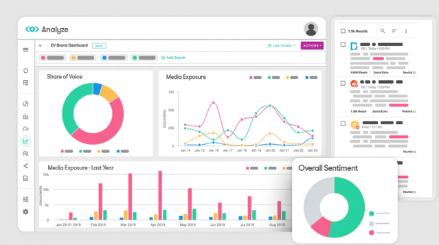 - Social listening tool tracks social posts, news, and publications of your brand