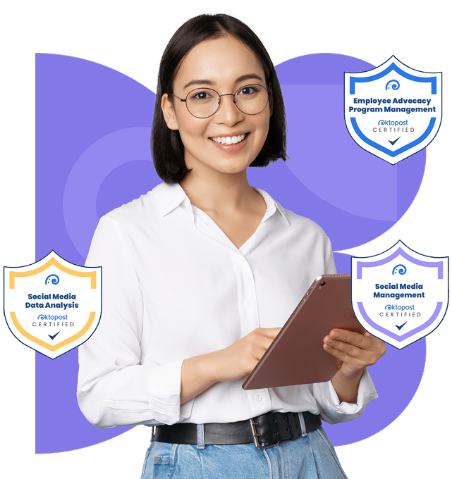 We provide customers with advanced SMM training and Oktopost Certifications in B2B Social Media Management, Data Analysis, Campaign Management, and Employee Advocacy Program Management.